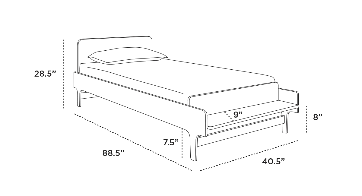 Sleepovers are made simple with the trundle, which tucks neatly away and can be used to store blankets and clothes when friends aren't around. For the littlest ones, a security rail can easily be added to either side of the bed. Fits standard American twin size bed mattress 74 ½" L x 38 ¼" W x 8".